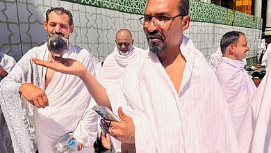 *حمامة تستقر مطمئنة فوق رأس معتمر سوداني أثناء صلاة الجمعة بالحرم المكي*