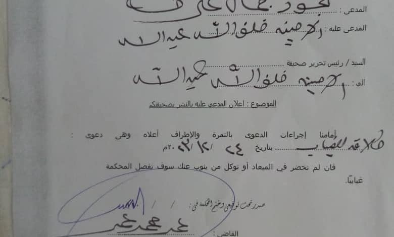 تم النشر يوم ٢٠٢٣/١٢/٦م جمهورية السودان السلطة القضائية محكمة الأحوال الشخصية مدني قضية نمرة ٢٢٥٥/ق/دائرة شرعية ٢٠٢٣م التاريخ ٢٠٢٣/١٢/٥م المدعي/نجودجمال علي طه المدعي عليه/الامين خلف الله عبدالله السيد/رئيس تحرير الحياه اليوم الموضوع /إعلان المدعي عليه بالنشر بصحيفة سودان 4نيوز