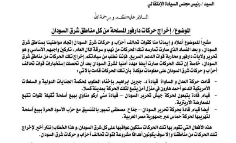 *الفريق ضرار أحمد ضرار يطالب مجلس السيادة بإخراج حركات دارفور المسلحة من شرق السودان *
