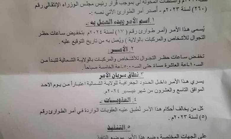 *تخفيض ساعات حظر التجوال بالشمالية ،لتبدأ من الساعة العاشرة مساء وحتى الخامسة صباحا*