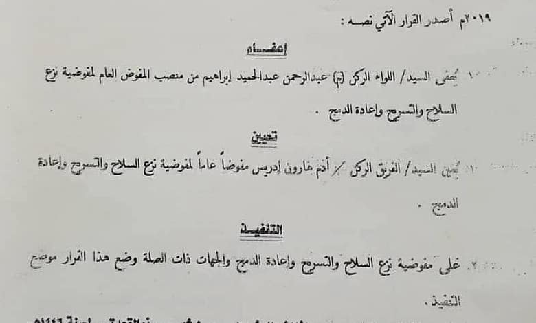 * عاجل : الفريق ادم هارون رئيسا لمفوضية نزع السلاح و إعادة الدمج*