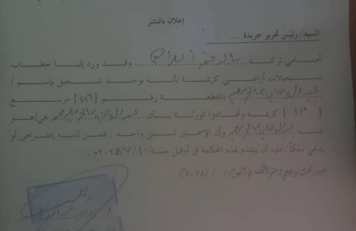 *محكمة كريمة للاحوال الشخصية النمرة / ٣١٨/ تركات / ٢٠٢٣ التاريخ ٢٩/ ٦/ ٢٠٢٥م الموضوع : الاسمين ١. عبد الوهاب صالح سعيد محمد ٢. عبد الوهاب صالح سعيد اعلان بالنشر*