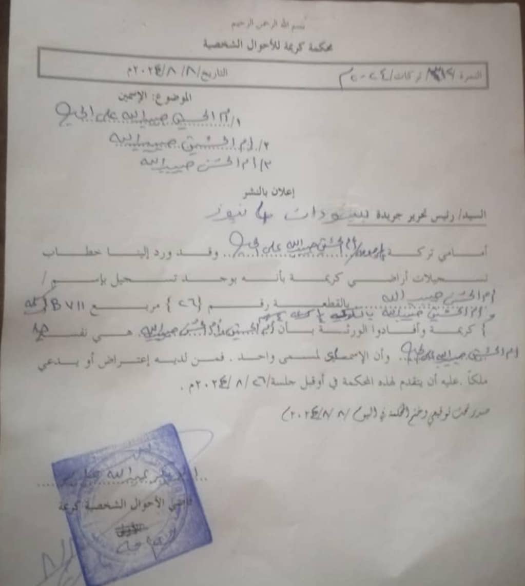 *محكمة مروي المدنية النمرة ق م/ ٩٩/ ٢٠٢٥م التاريخ ١٣/ ١١/ ٢٠٢٥م آمنة البشير محمد خير/ ضد محمد الحسن البشير الموضوع / اعلان بالنشر*