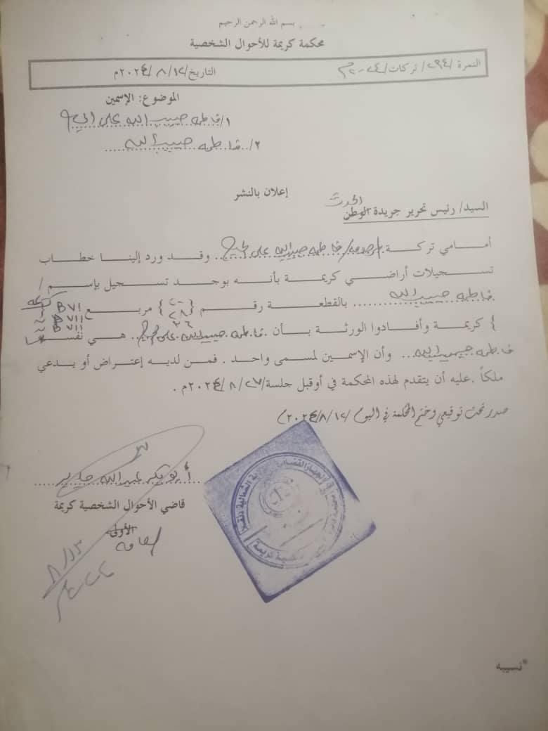 امامي تركه المرحومه فاطمة حبيب الله على الحاج. وقد َورد الخطاب تسجيلات كريمه باسم فاطمة حبيب الله بالقطعه رقم(28) (36) مربع( BVIl) القطع (20 )مربع( BVI) كريمة