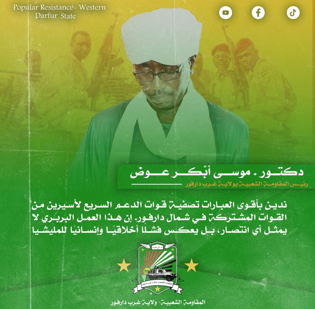 ادان الدكتور موسى أبكر عوض رئيس المقاومة الشعبية ولاية غرب دارفور إعدام أسرين لدي قوات الدعم السريع وقال د. موسي ندين بأقوى العبارات تصفية قوات الدعم السريع لأسيرين من القوات المشتركة في شمال دارفور. مؤكدا إن هذا العمل البربري لا يمثل أي انتصار، بل يعكس فشلًا أخلاقيًا وإنسانيًا للمليشيا.