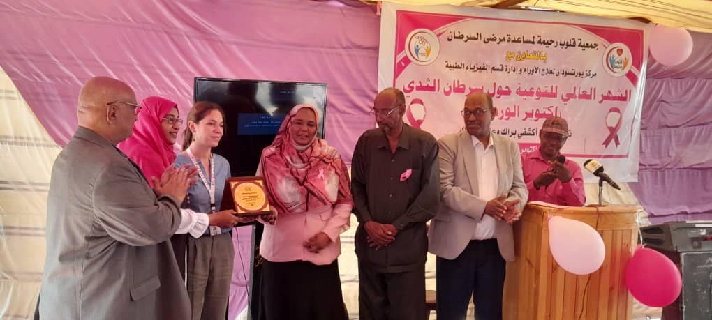 نظمت جمعية قلوب رحيمة لمساعدة مرضي السرطان بالتعاون مع مركز بورتسودان لعلاج الأورام وإدارة قسم الفيزياء الطبية برنامج الشهر العالمي للتوعية حول سرطان الثدي الذي يقدم في أكتوبر الوردي من كل عام ٠ تحت شعار (اكشفي براك وعلمي المعاك )٠