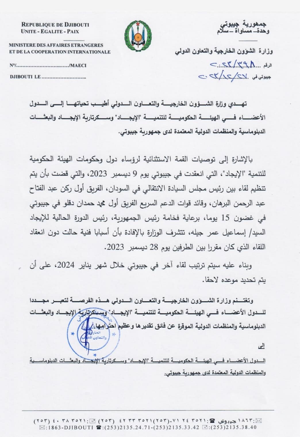 ‏(سودان 4نيوز ) تتحصل على خطاب وزارة خارجية جيبوتي إلى دول الإيقاد حول تعذر انعقاد اجتماع البرهان وحميدتي المقرر له اليوم الخميس؛ لأسباب فنية