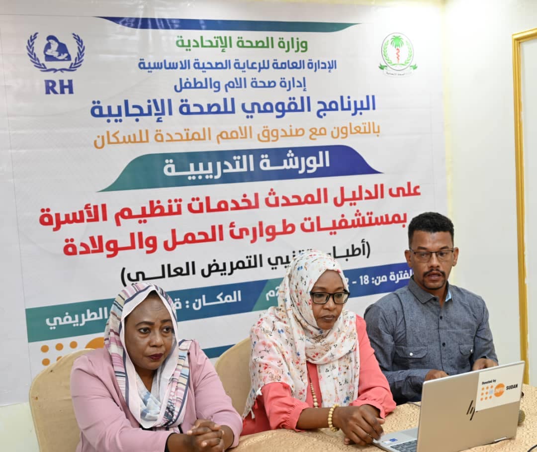 نظم البرنامج القومي للصحة الانجابية بوزارة الصحة الاتحادية، اليوم بقاعة الريح الطريفي بمدينة كسلا الورشة التدريبية على الدليل المحدث لخدمات تنظيم الأسرة بمستشفيات طوارئ الحمل والولادة، مستهدفة الأطباء وتقنيي التمريض العالي، بالتعاون مع صندوق الامم المتحدة للسكان، والتي تستمر حتى الجمعة القادمة.