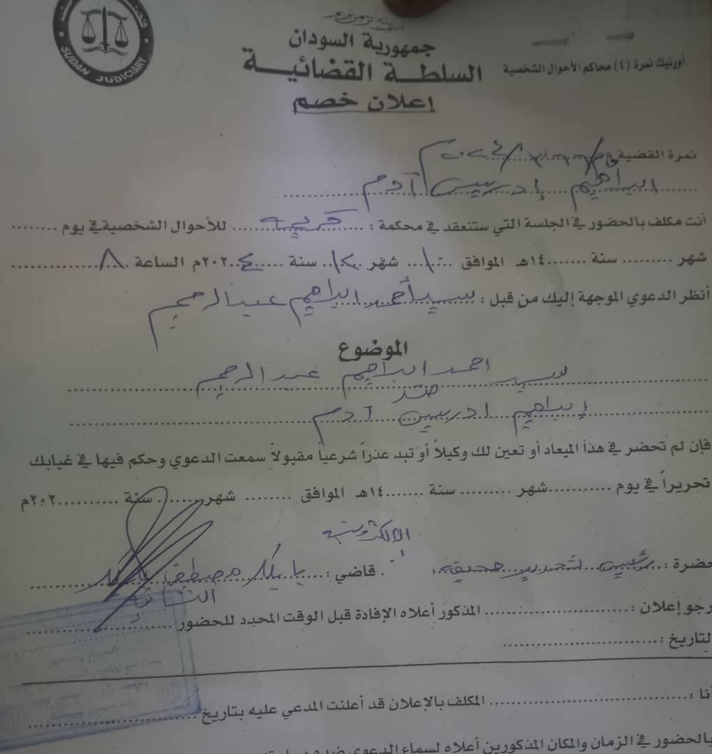ابراهيم إدريس ادم / انت مكلف لحضور جلسة يوم ١٠/ ١٢/ ٢٠٢٤م في الدعوى الموجهة إليك من قبل / سيد احمد ابراهيم عبد الرحيم ، فإن لم تحضر في هذا الميعاد او تعين لك وكيلا او تبدو عزرا شرعيا مقبولا سمعت الدعوى وحكم فيها في غيبتك.