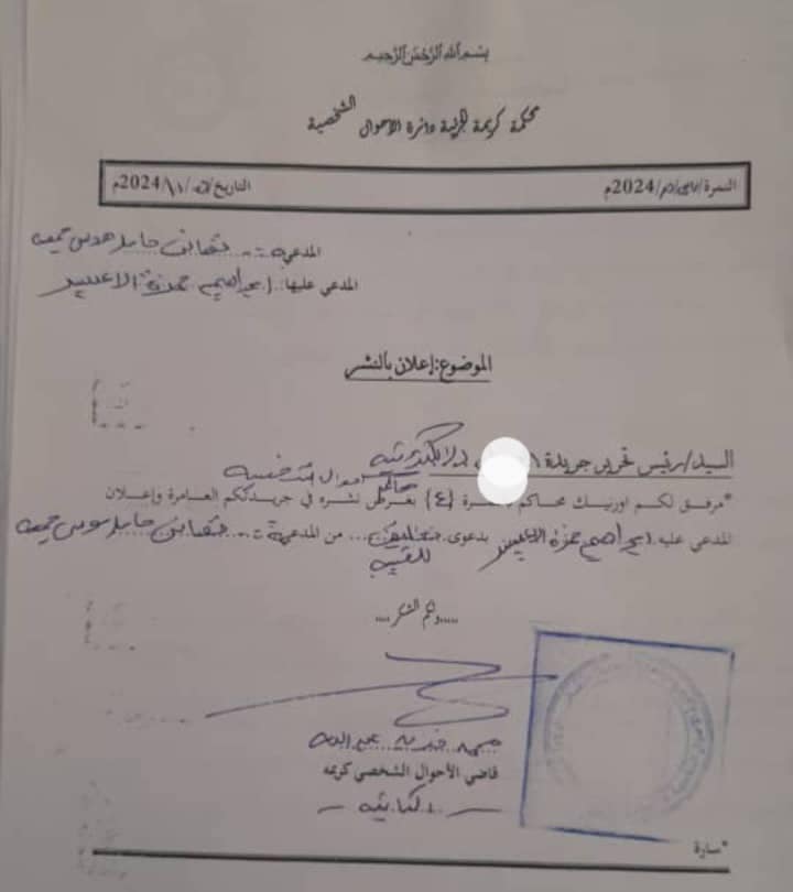 ابراهيم حمزة الاعيسر انت مكلف لحضور جلسة يوم ٩/ ١٢/ ٢٠٢٤م لنظر الدعوى الموجهة إليك من قبل / تهاني حامد موسى جمعة .. دعوى طلاق للغيبة.. فإن لم تحضر في هذا الميعاد او تعين لك وكيلا او تبدو عزرا شرعيا مقبولا سمعت الدعوى وحكم فيها في غيابك.