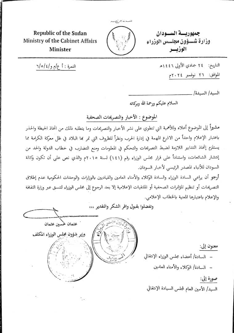 وجه مجلس الوزراء الإنتقالي السادة الوزراء ،والسادة الوكلاء والأمناء العامين والقياديين بالوزارات والوحدات الحكومية بالرجوع إلى المجلس عبر وزارة الثقافة والإعلام بإعتبارها المعنية بالخطاب الإعلامي فيما يتعلق بإطلاق التصريحات أو تنظيم اللقاءات الصحفية أو الملتقيات الإعلامية .