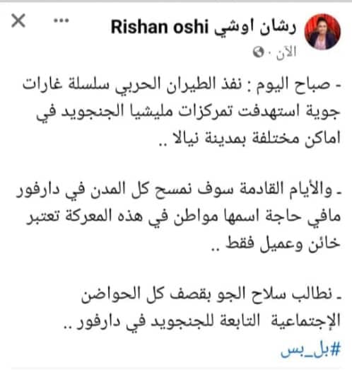 صفحة مزيفة تنتحل شخصيتي تتبع للالة الاعلامية للتمرد .. تعمل على نشر فبركات تثير الفتن القبلية .. في اطار مشروع التمرد الذي يهدف الى ضرب النسيج الاجتماعي في السودان والاستثمار في الصراع المجتمعي لصالح تفكيك البلاد .. ادناه رابط صفحتي الشخصية بها ١٥٤ الف متابع .. https://www.facebook.com/rishan0oshi?mibextid=vk8aRt0