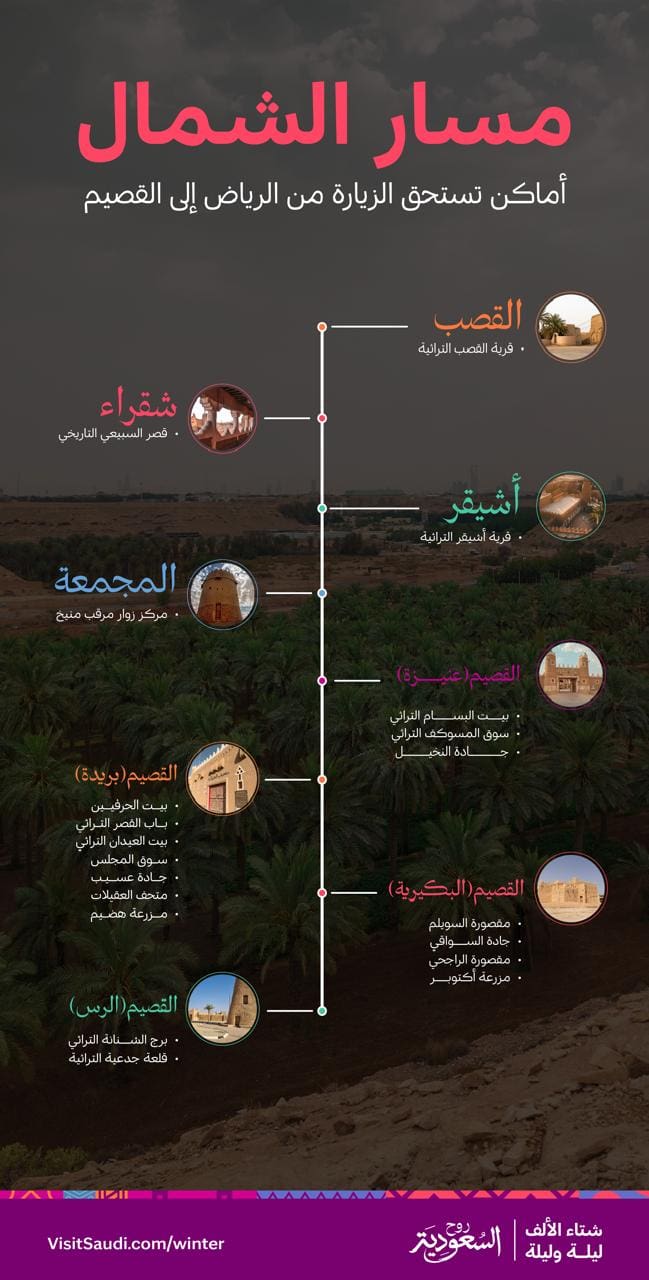 ويتضمن مسار الشمال عدداً من المواقع والمعالم الطبيعية والتاريخية والتراثية والترفيهية، بداية من قرية القصب التراثية التي تبعد 150 كيلومتراً عن مدينة الرياض، ثم على مسافة 35 كيلومتراً يأتي قصر السبيعي التاريخي في شقراء، ثم قرية أشيقر التراثية على بعد ما يقارب 20 كيلومتراً، ثم مرقب منيخ في المجمعة والذي يبعد عن أشيقر قرابة 70 كيلومتراً.