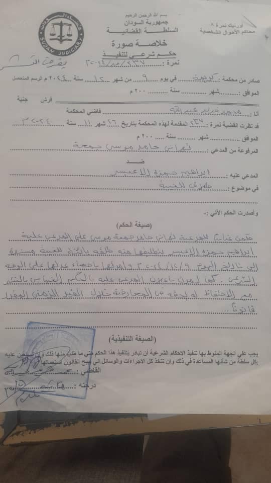 *محكمة كريمة الاحوال الشخصية النمرة ٢٣٧/ق / ٢٠٢٤. التاريخ ٩/ ١٢/ ٢٠٢٤م المدعي : تهاني حامد موسى جمعة المدعى عليه : ابراهيم حمزة الاعيسر الموضوع / حكم للنشر*