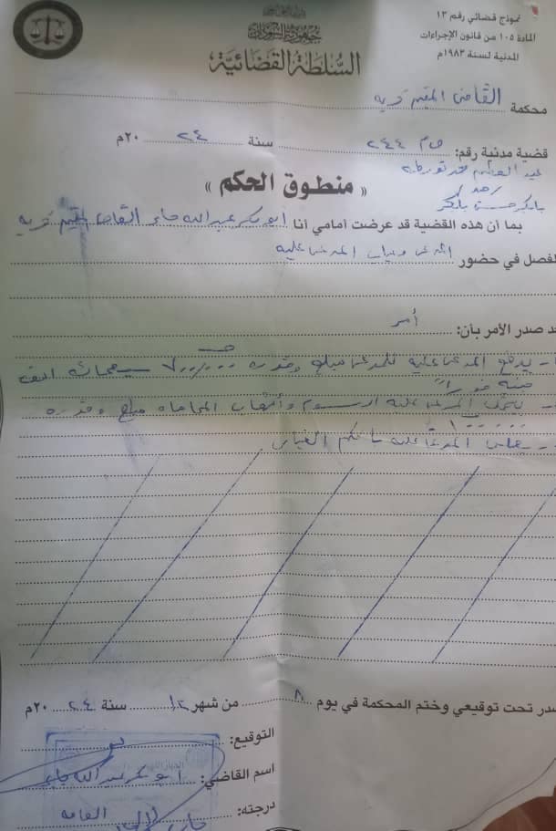 أمامي انا ابوبكر عبد الله جابر القاضي المقيم كريمة بحضور المدعي وغياب المدعى عليه