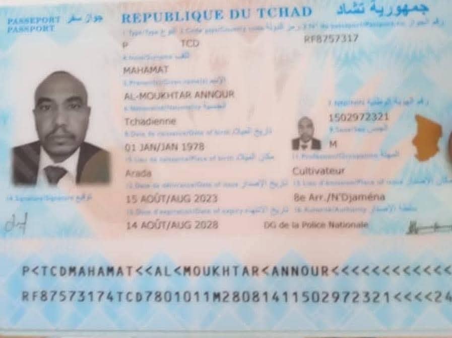 لمحمد المختار النور ببيانات كتب عليها تشادي الجنسية، مكان الميلاد: عراضة، تاريخ الميلاد: 1/1/1978م، ورقم الجواز / RF8757317-المهنة: مزارع اصدار انجمينا بتاريخ 15/8/2023م .