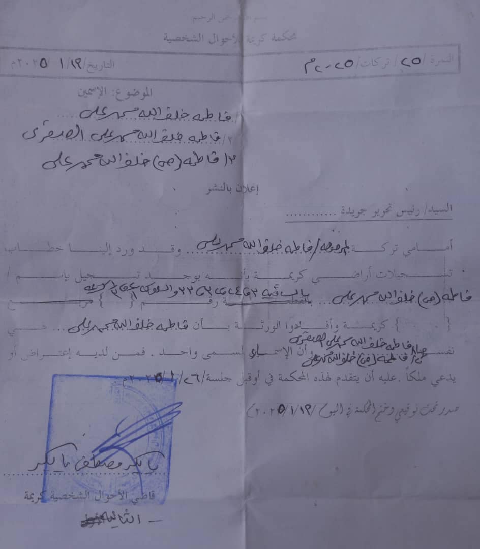وأفادوا الورثة بأن / فاطمة خلف الله محمد علي هي نفسها / ١. فاطمة خلف الله محمد علي الصغرى ٢. فاطمة (ص) خلف الله محمد علي وان الاسماء لمسمى واحد . فمن لديه اعتراض او يدعي ملكا .. عليه أن يتقدم لهذه المحكمة في أو قبل جلسة ٢٦ / ١/ ٢٠٢٥م