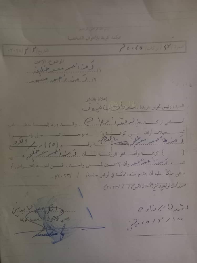 وأفادوا الورثة بأن / آمنة احمد محمد خليفة هي نفسها /آمنة احمد محمد وان الاسمين لمسمى واحد . فمن لديه اعتراض او يدعي ملكا .. عليه أن يتقدم لهذه المحكمة في أو قبل جلسة ١٧ / ٣/ ٢٠٢٥م