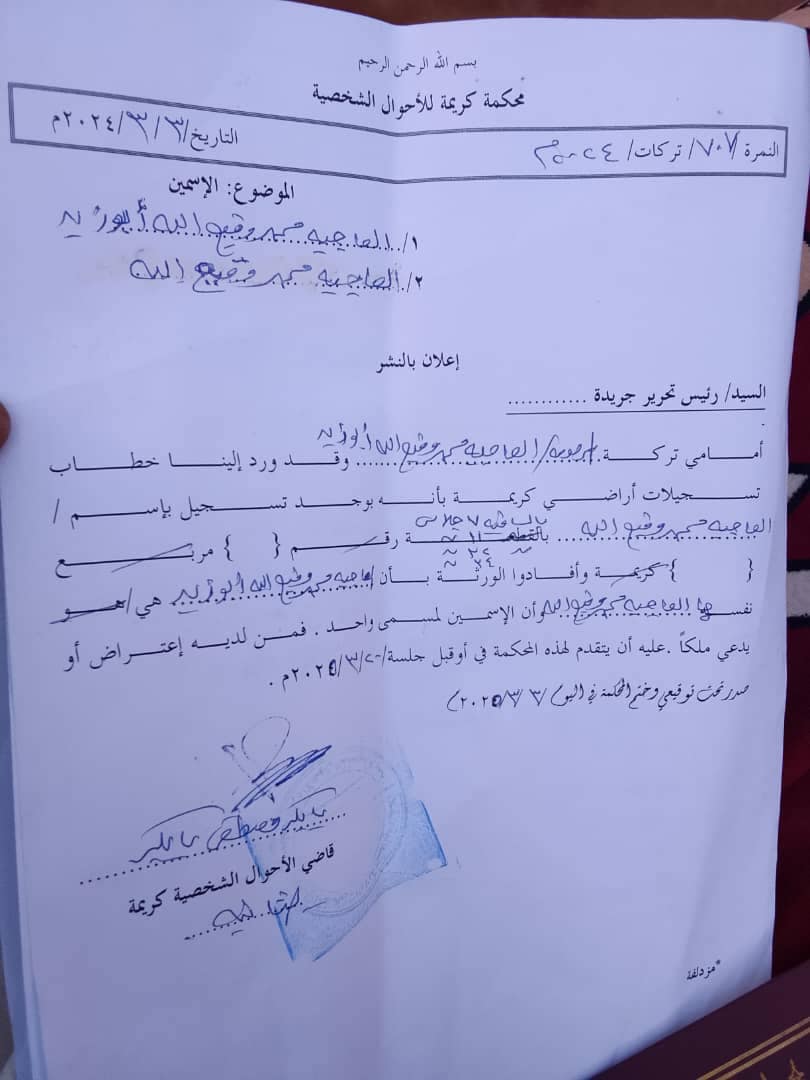 وأفادوا الورثة بأن / العاجبة محمد وقيع الله ابوزيد.. هي نفسها / العاجبة محمد وقيع الله وان الاسمين لمسمى واحد . فمن لديه اعتراض او يدعي ملكا .. عليه أن يتقدم لهذه المحكمة في أو قبل جلسة ٢٠ / ٣/ ٢٠٢٥م