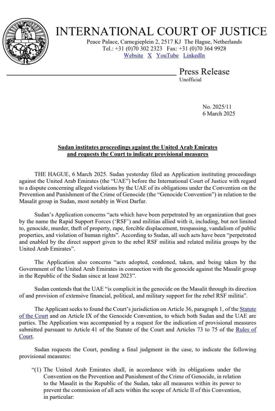 لاهاي، 6 مارس 2025 – قدّمت السودان أمس طلبًا لرفع دعوى قضائية ضد الإمارات العربية المتحدة (“الإمارات”) أمام محكمة العدل الدولية بشأن نزاع يتعلق بانتهاكات مزعومة من قبل الإمارات لالتزاماتها بموجب اتفاقية منع جريمة الإبادة الجماعية والمعاقبة عليها (“اتفاقية الإبادة الجماعية”) فيما يخص مجموعة المساليت في السودان، وخاصة في غرب دارفور.