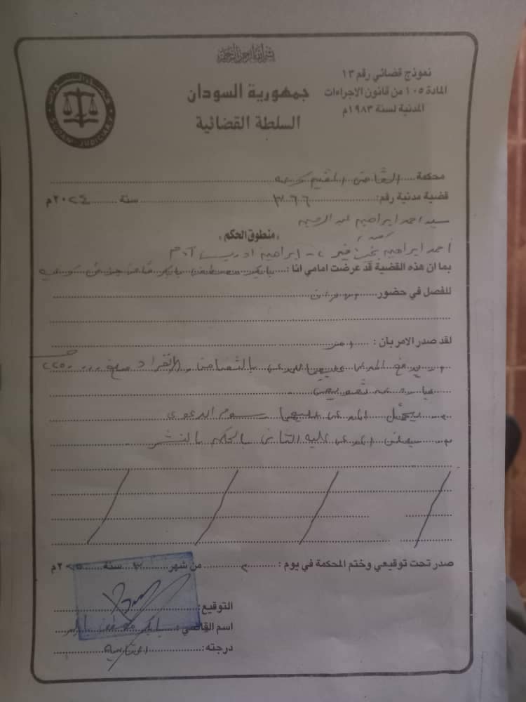 أمامي انا بابكر مصطفى محمد قاضي جزئي كريمة في حضور الأطراف صدر الأمر الآتي :