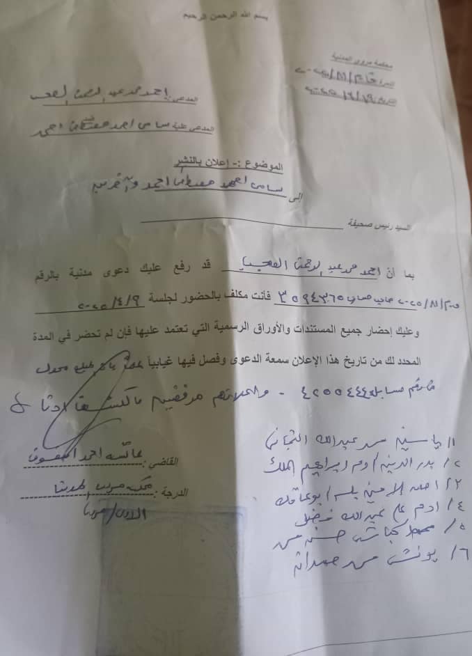 بما أن / احمد محمد عبد الرحمن العجب قد رفع عليك دعوىمدنية بالرقم (ق.م/ ٨١/ ٢٠٢٥م) حساب رقم ٣٥٩٤٣٦٥ فأنت مكلف بالحضور لجلسة ٩/ ٤/ ٢٠٢٥م وعليك إحضار جميع المستندات والأوراق الرسمية التي تعتمد عليهافان لم تحضر في المدةالمحددة لك من تاريخ هذا الإعلان سُمعت الدعوى وفصل فيها غيابيا علما بأن المبلغ محول في رقم حسابك ٤٢٥٥٤٤٤ . واعلانهم مرفقين بالكشف أدناه :