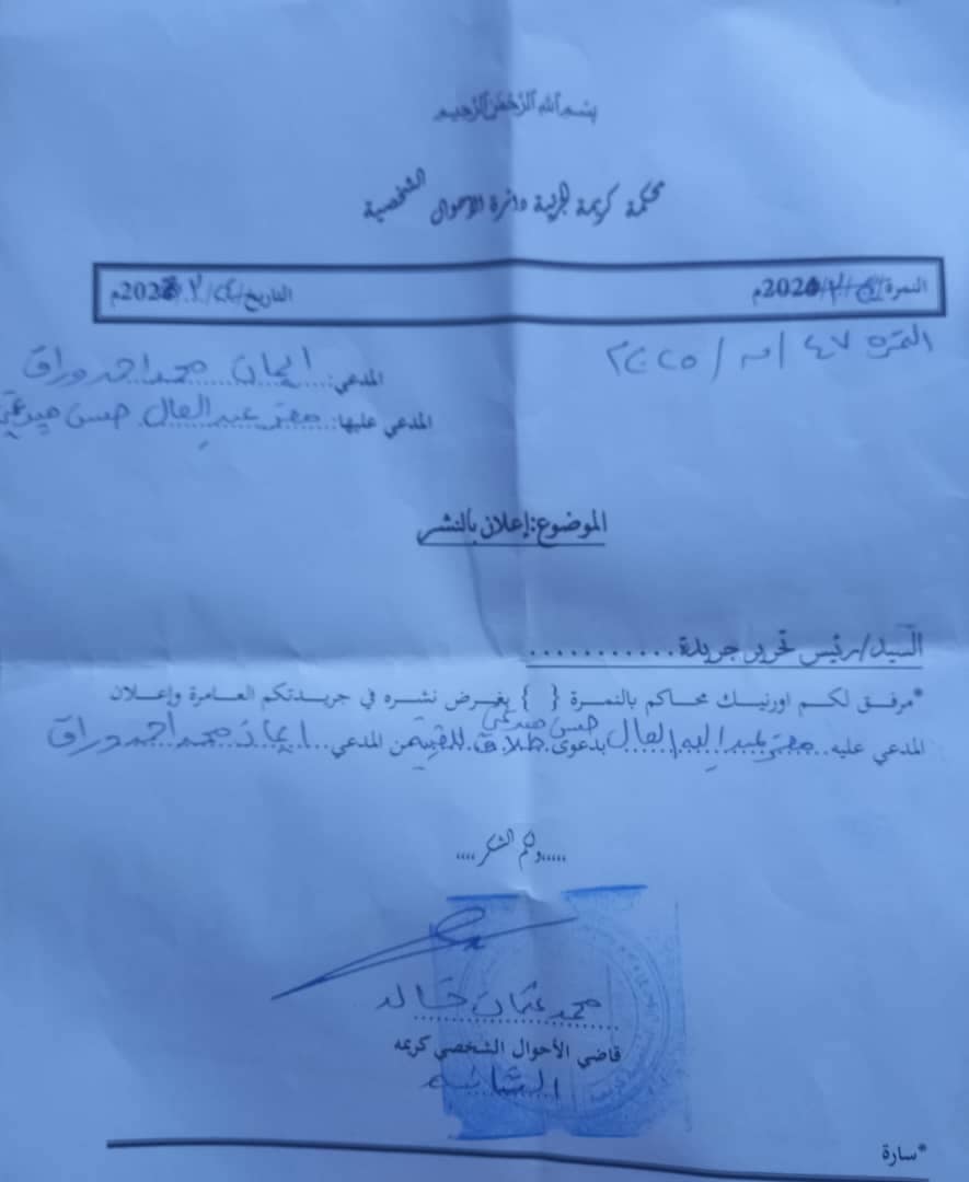 معز عبد العال حسن ميرغني انت مكلف لحضور جلسة يوم ١٠/ ٤/ ٢٠٢٥م لنظر الدعوى الموجهة إليك من قبل / ايمان محمد احمد وراق .. دعوى طلاق للغيبة.. فإن لم تحضر في هذا الميعاد او تعين لك وكيلا او تبدو عزرا شرعيا مقبولا سمعت الدعوى وحكم فيها في غيابك.