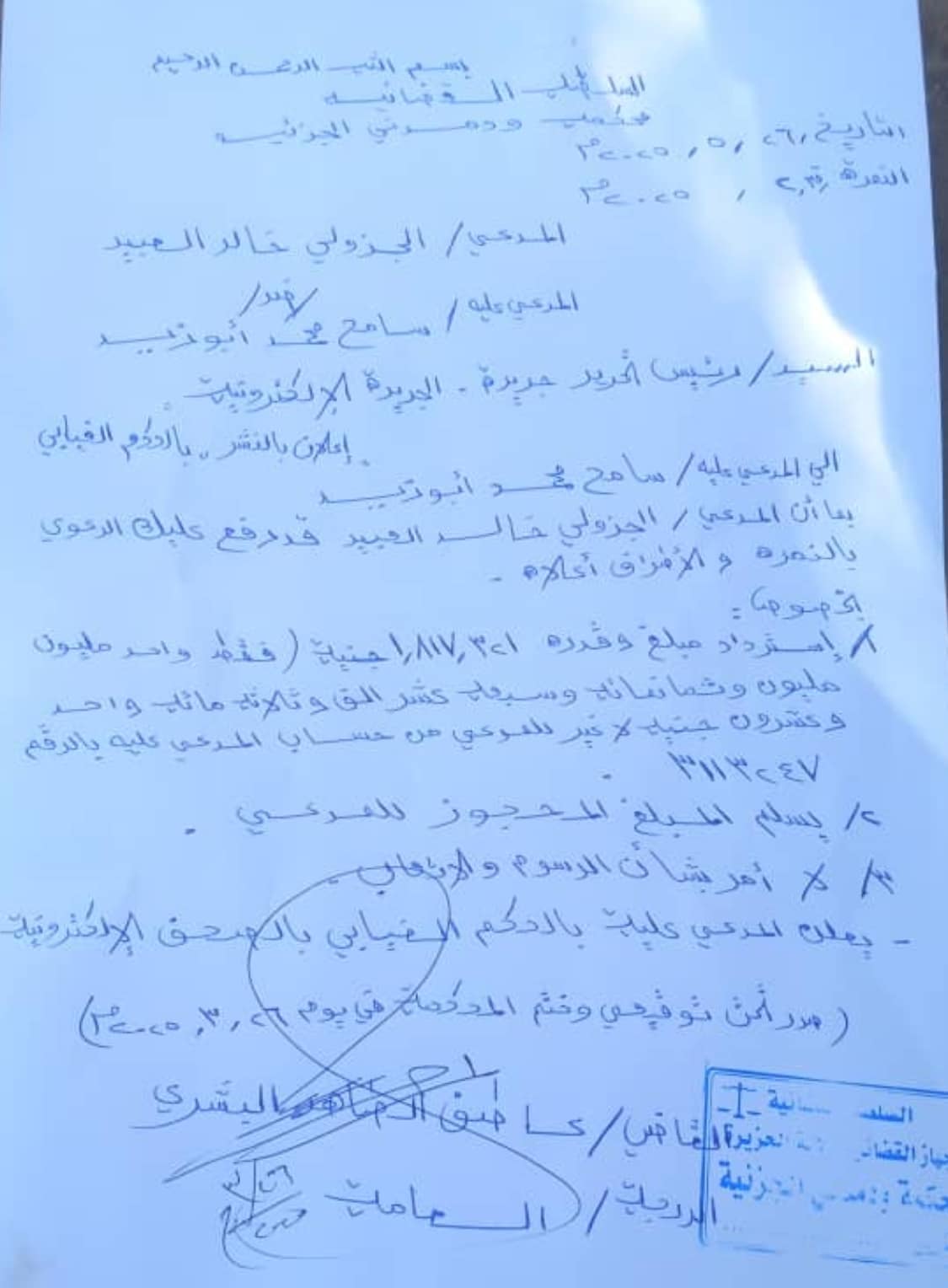 السيد رئيس تحرير صحيفة سودان 4نيوز لإلكترونية. اعلان بالنشر بالحكم الغيابي..الي المدعي عليه سامح محمد ابو زيد… بما ان المدعي الجزولي خالد العبيد فدر رفع عليك الدعوي بالنمره والاطراف اعلاه ..بخصوص