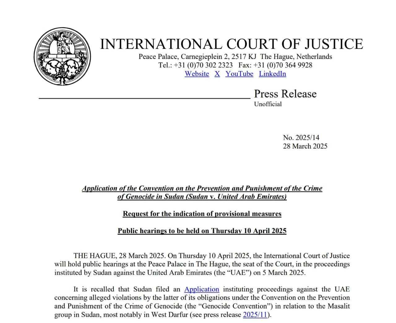 يُذكر أن السودان قدّم طلبًا لإقامة دعوى ضد الإمارات العربية المتحدة بشأن انتهاكات مزعومة من جانبها لالتزاماتها بموجب اتفاقية منع جريمة الإبادة الجماعية والمعاقبة عليها (“اتفاقية الإبادة الجماعية”) فيما يتعلق بجماعة المساليت في السودان، ولا سيما في غرب دارفور (انظر البيان الصحفي ٢٠٢٥/١١).