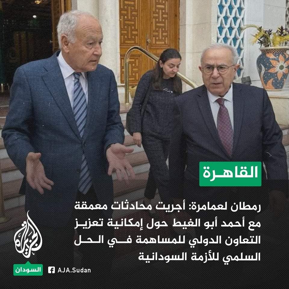 المبعوث الشخصي للأمين العام للأمم المتحدة رمطان لعمامرة: أجريت محادثات معمقة مع الأمين العام لجامعة الدول العربية أحمد أبو الغيط بالقاهرة حول إمكانية تعزيز التعاون الدولي للمساهمة في الحل السلمي للأزمة السودانية