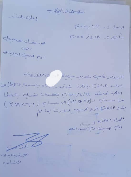 آدم صديق آدم عبد الله انت مكلف لحضور جلسة يوم ١٤/ ٤/ ٢٠٢٥م لنظر الدعوى الموجهة إليك من قبل / عمر عثمان محمد جبريل .. بخصوص تحويل خطأ.. من الحساب بالرقم (2113876) الى الحساب بالرقم (3192601) بنك الخرطوم فرع كريمة فإن لم تحضر في هذا الميعاد او تعين لك وكيلا او تبدو عزرا شرعيا مقبولا سمعت الدعوى وحكم فيها في غيابك.