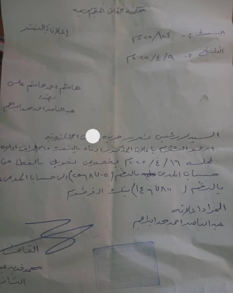 انت مكلف لحضور جلسة يوم ١٦/ ٤/ ٢٠٢٥م لنظر الدعوى الموجهة إليك من قبل / هاشم احمد هاشم علي.. بخصوص تحويل خطأ.. من الحساب بالرقم (2568705) الى الحساب بالرقم (1467800) بنك الخرطوم فرع فإن لم تحضر في هذا الميعاد او تعين لك وكيلا او تبدو عزرا شرعيا مقبولا سمعت الدعوى وحكم فيها في غيابك.