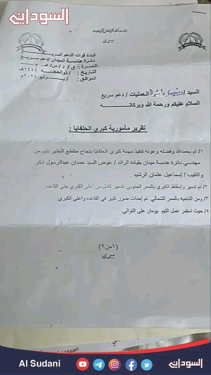 وتقول المراسلات السرية، التي كتبها رئيس دائرة هندسة الميدان لمليشيا الدعم السريع، الرائد عوض السيد حمدان عبد الرسول أبكر، إلى رئيس دائرة العمليات بالدعم السريع، بتاريخ 24 يوليو 2024م، بعنوان (تقرير مأمورية كوبري الحلفايا): “تم بحمد الله وفضله وعونه تنفيذ مهمة كوبري الحلفايا، بنجاح منقطع النظير، بتيم من مهندسي دائرة هندسة الميدان، بقيادة الرائد، عوض السيد حمدان عبد الرسول أبكر، والنقيب إسماعيل عثمان الرشيد”.