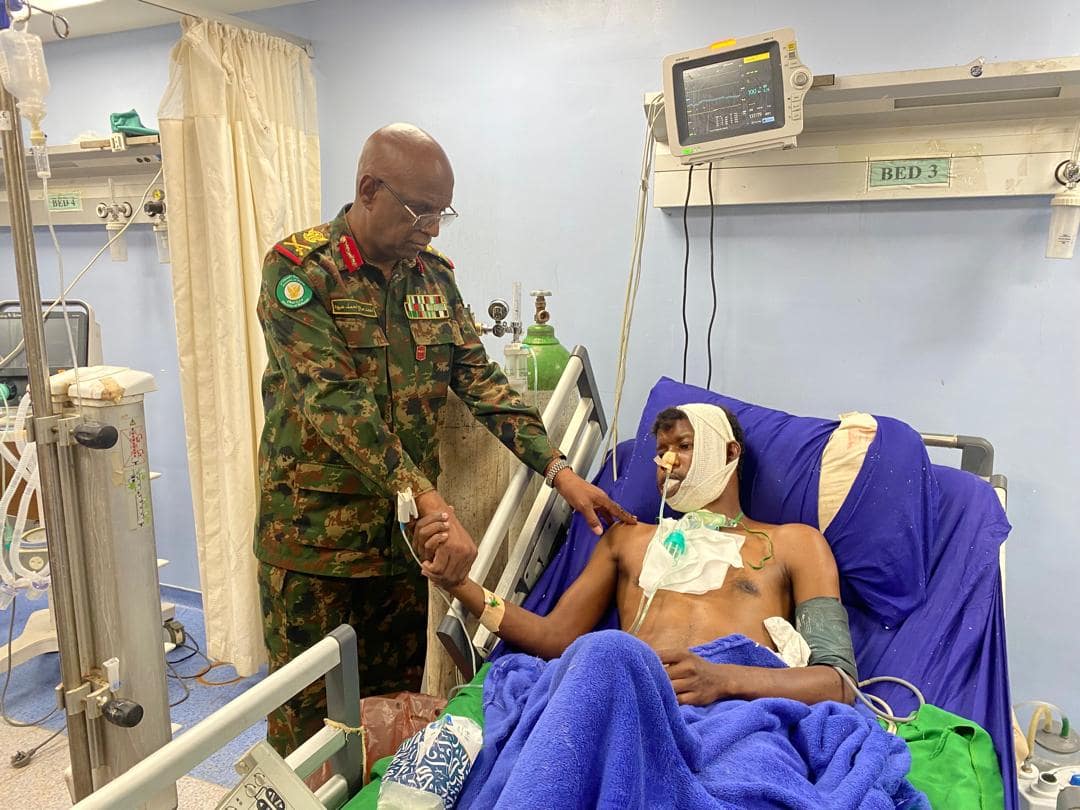 ومن ضمن زيارته لمنطقة أمدرمان العسكرية تفقد جرحي عمليات معركة الكرامة بقاعدة أمدرمان الطيبة واطمأن علي المصابين واستمع لننويرا علي حالاتهم الصحيه و اشاد بالدور المتعاظم الذي تقوم به الكوادر الطيبة بالقاعدة الطبيه .
