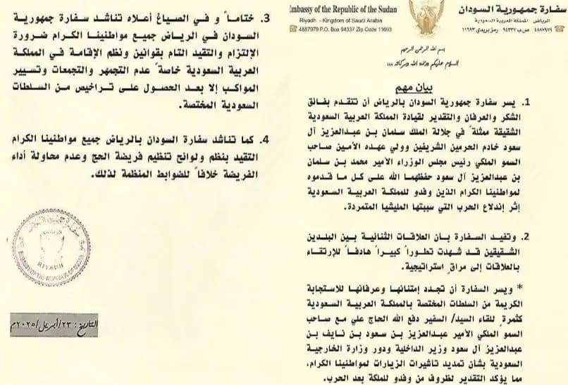 وأضاف ان السفارة تناشد جميع المواطنين ضرورة الألتزام والتقيد التام بقوانين ونظم الاقامة في المملكة العربية السعودية خاصة عدم التجمع والتجمعات وتسير المواكب الا بعد الحصول الي ترخيص من السلطات السعودية كما تناشد السفارة بالرياض جميع المواطنين التقيد بنظم ولوائح فريضة الحج وعدم محاولة أداء الفريضة خلافا للضوابط المنظمة لذلك