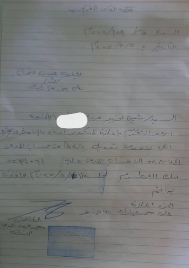 انت مكلف لحضور جلسة يوم ١١/ ٥/ ٢٠٢٥م لنظر الدعوى الموجهة إليك من قبل / يعقوب عيسى عثمان .. بخصوص تحويل خطأ.. من حساب المدعي بالرقم (5280741) الى الحساب بالرقم (5231061) بنك الخرطوم فإن لم تحضر في هذا الميعاد او تعين لك وكيلا او تبدو عزرا شرعيا مقبولا سمعت الدعوى وحكم فيها في غيابك.