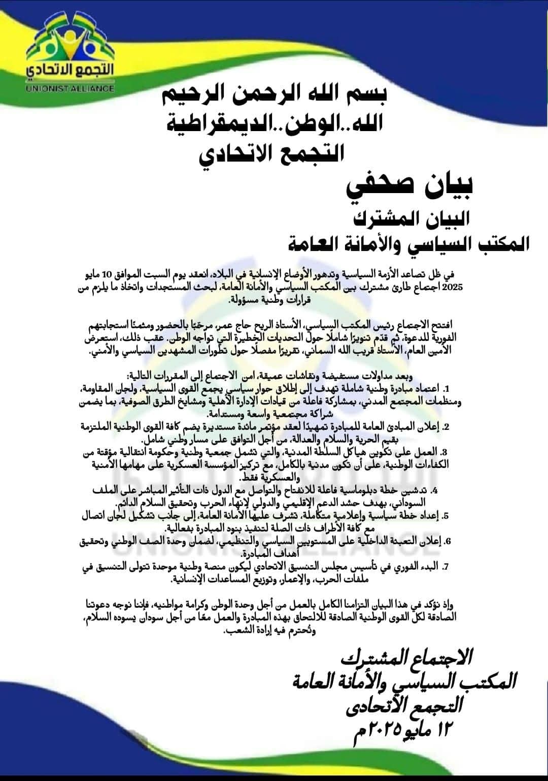 وإذ نؤكد في هذا البيان التزامنا الكامل بالعمل من أجل وحدة الوطن وكرامة مواطنيه، فإننا نوجه دعوتنا الصادقة لكل القوى الوطنية الصادقة للالتحاق بهذه المبادرة والعمل معًا من أجل سودان يسوده السلام، وتُحترم فيه إرادة الشعب.