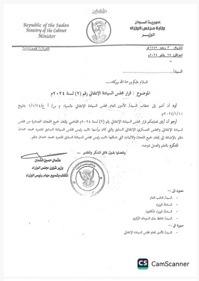 *مجلس السيادة يصدر قرارا بالغاء جميع اللجان التي كونها نائب رئيس مجلس السيادة السابق حميدتي*