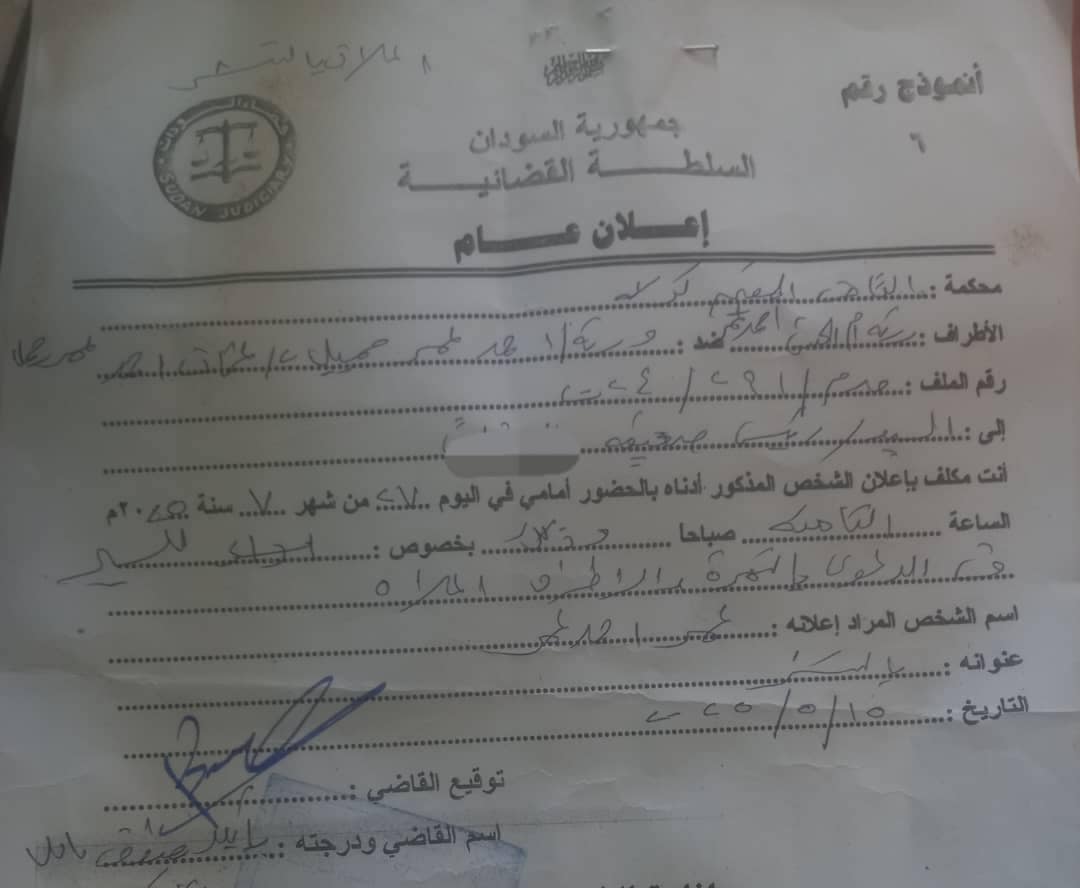 ٢٧/ ٧/ ٢٠٢٥م لنظر الدعوى الموجهة إليك من قبل / ورثة ام الحسن احمد عمر .. فإن لم تحضر في هذا الميعاد او تعين لك وكيلا او تبدو عزرا شرعيا مقبولا سمعت الدعوى وحكم فيها في غيابك.