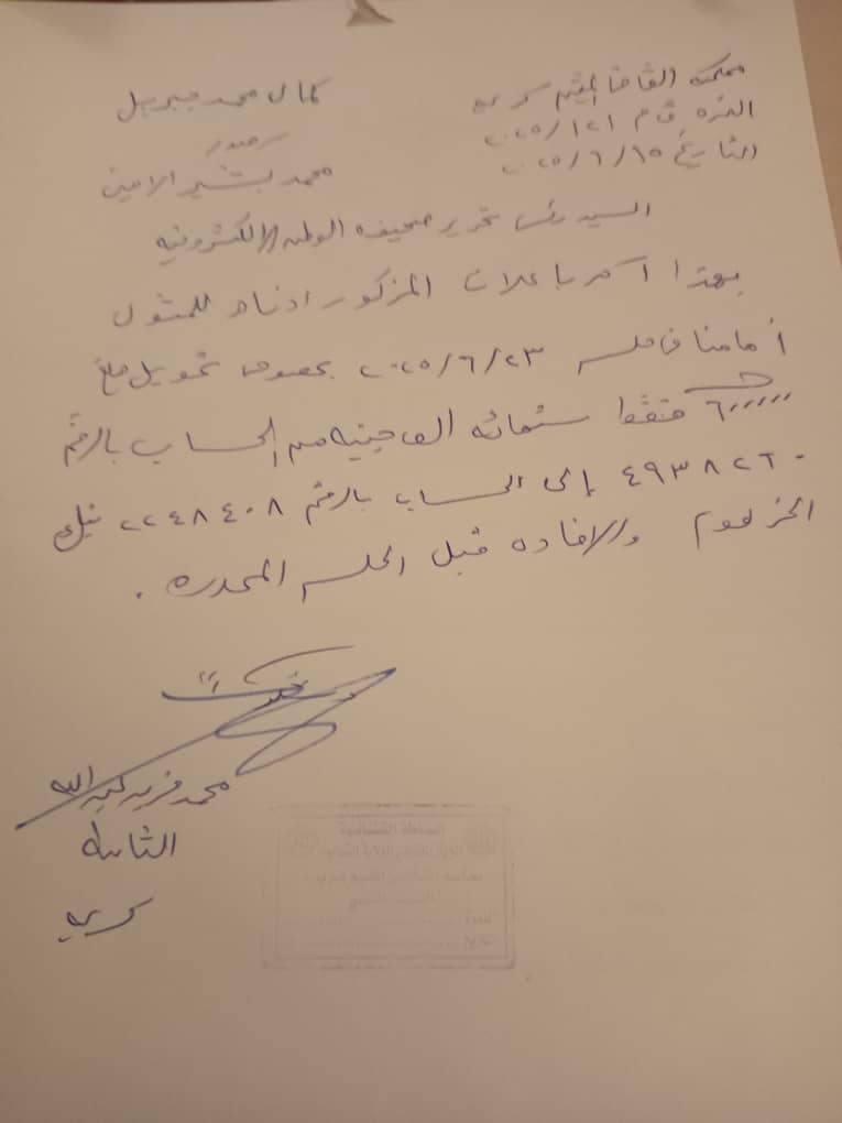 انت مكلف لحضور جلسة يوم ٢٣/ ٦/ ٢٠٢٥م لنظر الدعوى الموجهة إليك من قبل / كمال محمد جبريل بخصوص تحويل خطأ مبلغ ٦٠٠.٠٠٠ج ستمائة الف جنيه من حساب المدعي بالرقم (4938260) الى حساب المدعى عليه بالرقم (2248408) بنك الخرطوم فإن لم تحضر في هذا الميعاد او تعين لك وكيلا او تبدو عزرا شرعيا مقبولا سمعت الدعوى وحكم فيها في غيابك.