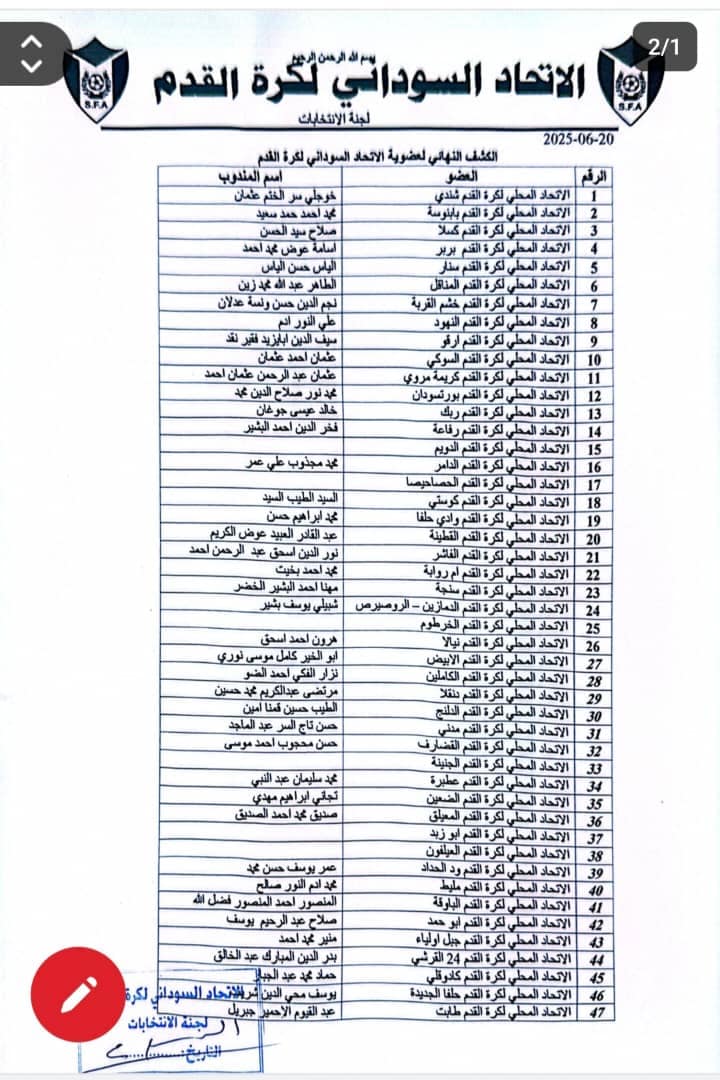 نشرت لجنة الإنتخابات بالاتحاد السوداني لكرة القدم برئاسة اللواء شرطة حقوقي دكتور آدم إبراهيم محمد الحاج يوم الجمعة 20 يونيو 2025م الكشف النهائي لعضوية الجمعية العمومية الإنتخابية للإتحاد دورة 2025م_2029م والكشف النهائي لمرشحي قائمة الدكتور معتصم جعفر سر الختم.