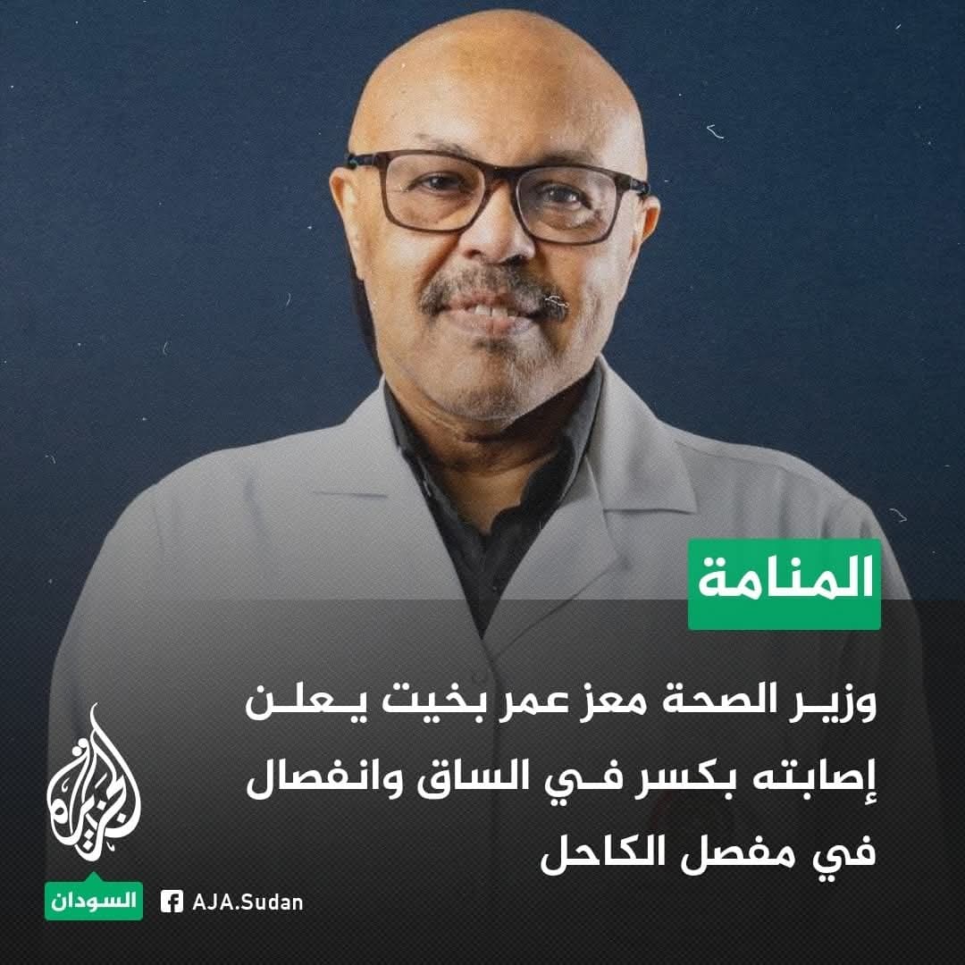 وزير الصحة معز عمر بخيت يعلن إصابته بكسر في الساق وانفصال في مفصل الكاحل بسبب تعثّره وسقوطه على عتبات أسمنتية خلال وصوله إلى النادي السوداني في البحرين، لحضور حفل نظّمه أبناء الجالية السودانية بالمملكة لوداعه، ويؤكد تثبيت الكسر وإعادة المفصل إلى مكانه، ويقرّر السفر إلى لندن لاستكمال الفحوصات وتقييم الحالة ومتابعة العلاج