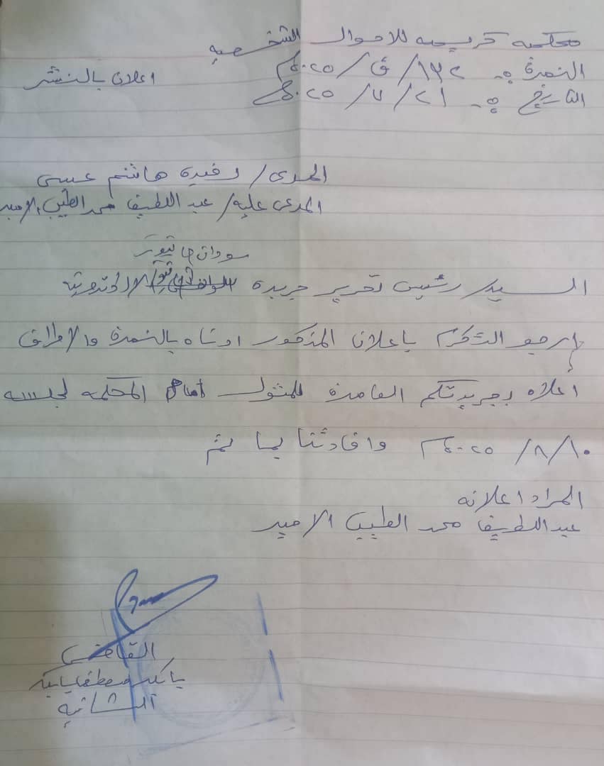 عبد اللطيف محمد الطيب الأمير انت مكلف لحضور الجلسة المقامة بتاريخ ١٠/ ٨/ ٢٠٢٥م لنظر الدعوى اعلاه والافادة بما تم فإن لم تحضر في هذا الميعاد او تعين لك وكيلا او تبدو عزرا شرعيا مقبولا سمعت الدعوى وحكم فيها في غيابك.