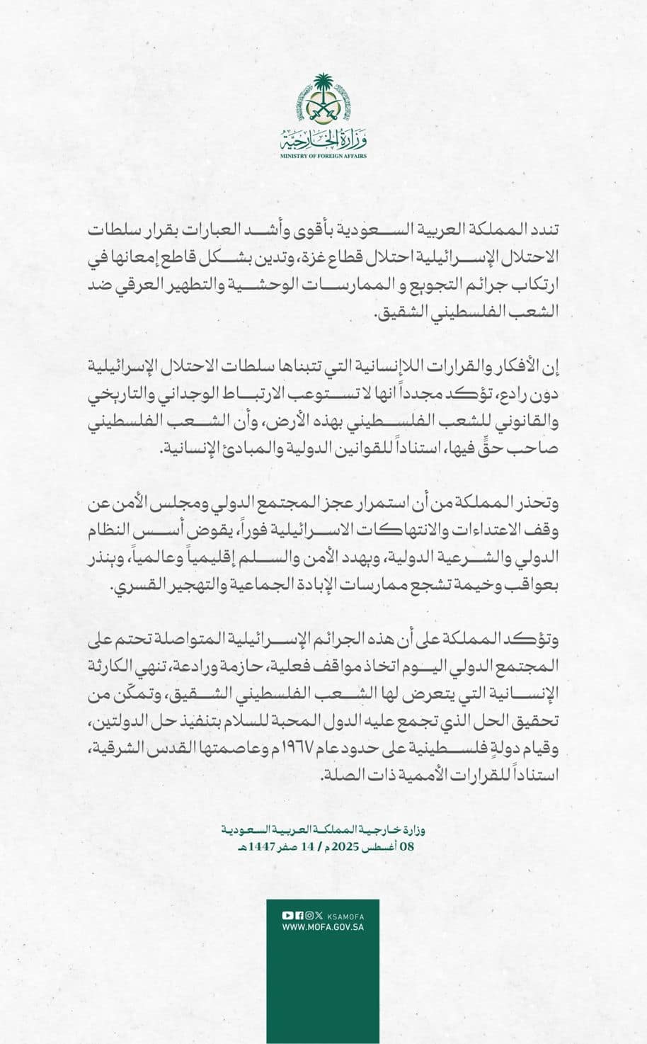 نددت السعودية بأقوى وأشد العبارات بقرار سلطات الاحتلال الإسرائيلية احتلال قطاع غزة، كما أدانت بشكل قاطع إمعانها في ارتکاب جرائم التجويع والممارسات الوحشية والتطهير العرقي ضد الشعب الفلسطيني الشقيق، وفقاً لما ذكرته الخارجية السعودية.