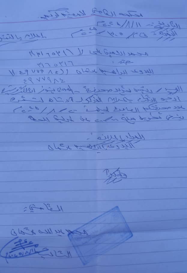 انت مكلف لحضور جلسة يوم ٢٠/ ٨/ ٢٠٢٥م لنظر الدعوى الموجهة إليك من قبل / محمد الأمين علي بخصوص تحويل خطأ مبلغ ٢٠٠.٠٠٠ ج مائتي الف جنيه من حساب المدعي بالرقم (3165316) الى حساب المدعى عليه بالرقم (4977984) بنك الخرطوم فإن لم تحضر في هذا الميعاد او تعين لك وكيلا او تبدو عزرا شرعيا مقبولا سمعت الدعوى وحكم فيها في غيابك.