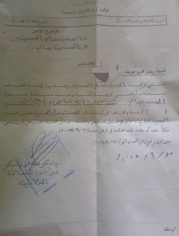 وأفادوا الورثة بأن / الحسين صالح الحسين هو نفسه / الحسين صالح وان الاسمين لمسمى واحد . فمن لديه اعتراض او يدعي ملكا .. عليه أن يتقدم لهذه المحكمة في أو قبل جلسة ٣ / ٩/ ٢٠٢٥م
