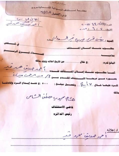 انت مكلف بالرد على عريضة الاستئناف خلال (٧ أيام) وتحصيل مبلغ (٥٠٠٠ج) وافادتنا بذلك عند الرد .
