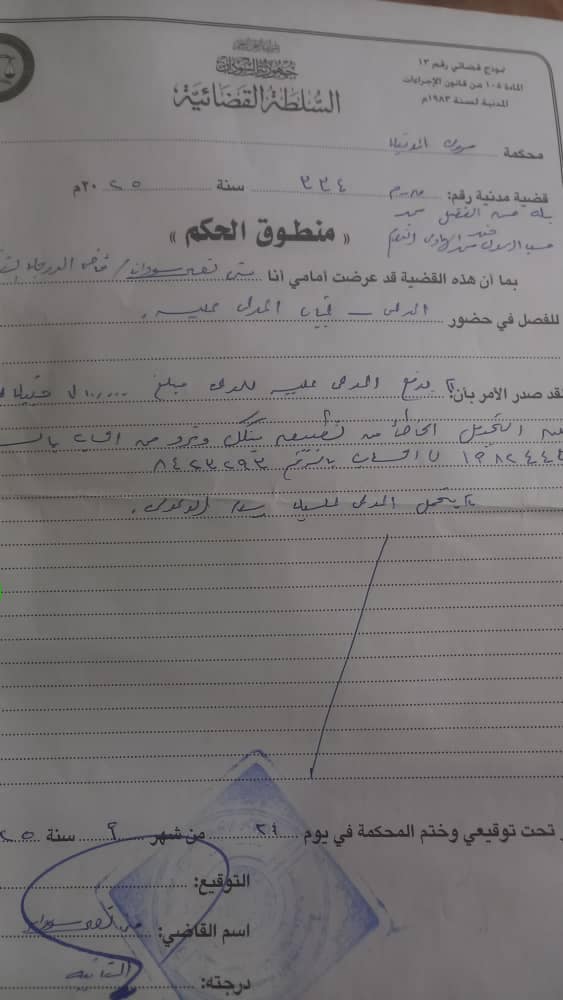 اصدرت محكمة مروي المدنية حكمها بالآتي : في الدعوى المدنية بالنمرة والأطراف اعلاه :