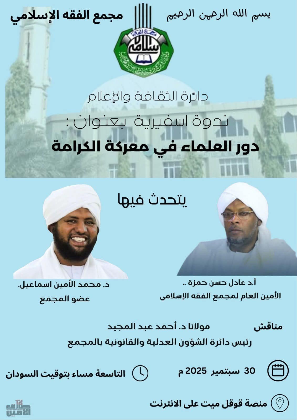 أكد مجمع الفقه الإسلامي أن الحرب في السودان تمضي نحو نهاياتها بهزيمة ساحقة للمليشيا ونصر مؤزر للجيش الوطني وكتائب الإسناد، مشيرا لدور العلماء تصحيح المفاهيم الخاطئة حول الجهاد ضد المليشيا التي تقاتل نيابة عن الكفار، ووكالة عن غيرها، وأن ما فعلته المليشيا بالشعب السودان أكبر من أهل الحرابة الذين حدهم القتل مع الصلب.