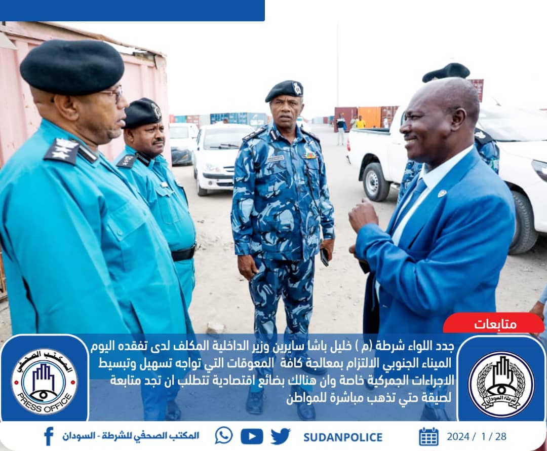 فيما جدد وزير الداخلية المكلف الالتزام بمعالجة كافة المعوقات التي تواجه تسهيل وتبسيط الاجراءات خاصة وان هنالك بضائع اقتصادية تتطلب ان تجد متابعة لصيقة حتي تذهب مباشرة للمواطن ، مشيرا الي ان العمل الجمركي يتطلب السرعة والدقة عبر استخدام التقنية في كافة الاعمال الجمركية ، مبينا ان الزيارة كشفت عن مشاكل مرتبطة بجهات أخري سيتم التنسيق والتعاون معهم حتي لا يتضرر المواطن ، فيما عقد وزير الداخلية المكلف اجتماع مع قيادة الميناء الجنوبي استمع من خلاله لمطلوبات العمل التي تسهل وتبسط للمواطنين تخليص بضائعهم في اقل فترة ممكنه